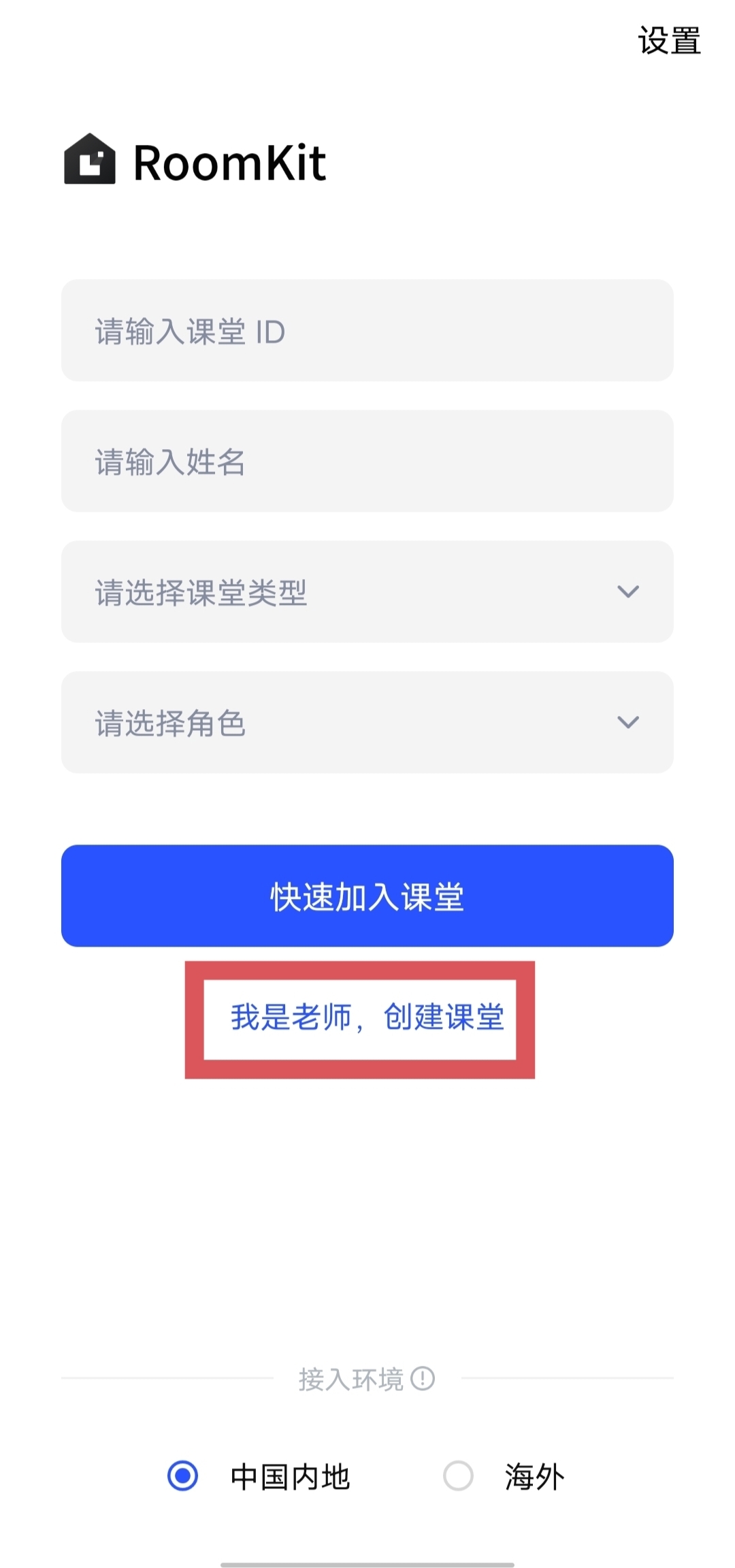 进行体验时,建议先用一台设备作为 “老师” 创建课堂(界面截图以 Android 为例);