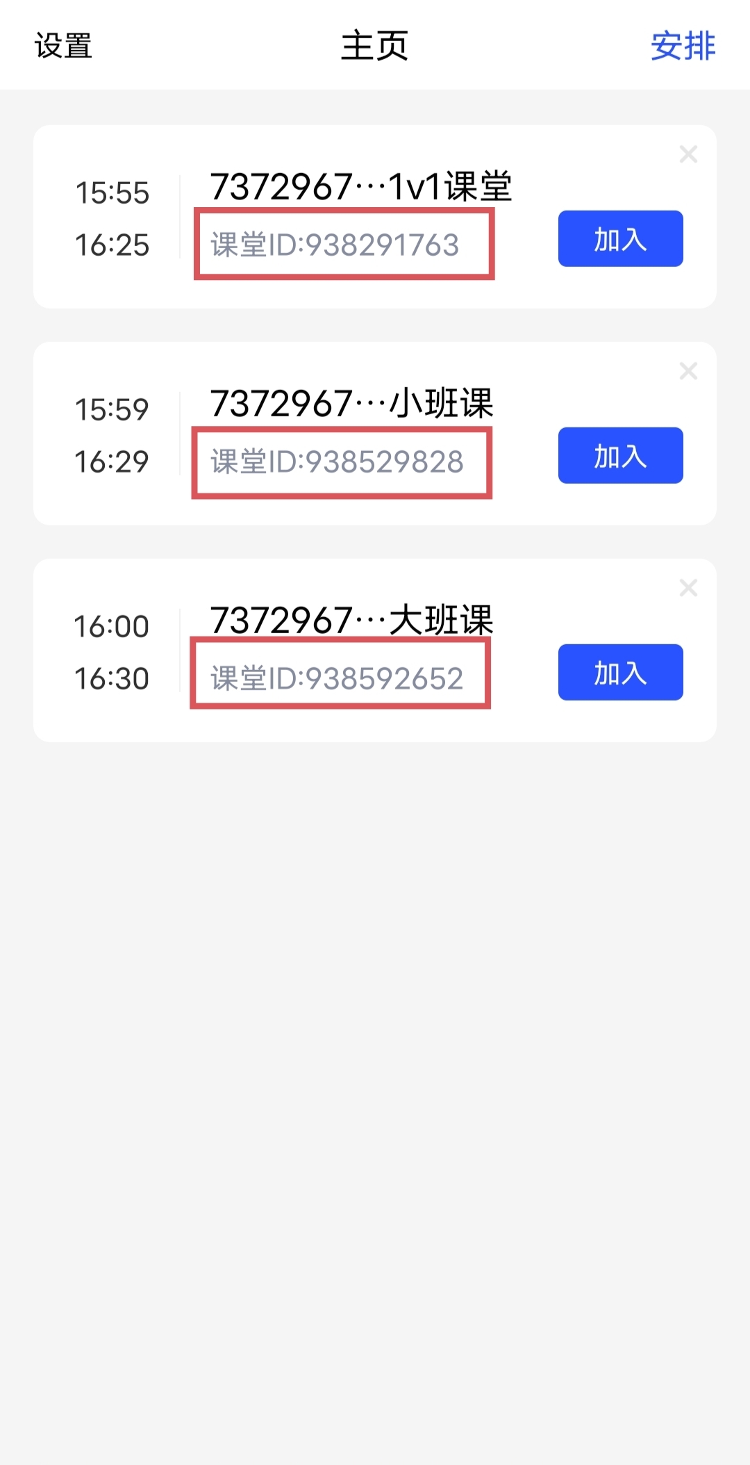 课堂创建成功后,可记录课堂 ID ,再使用其他设备作为 “学生” 和 “助教” 加入课堂进行体验。