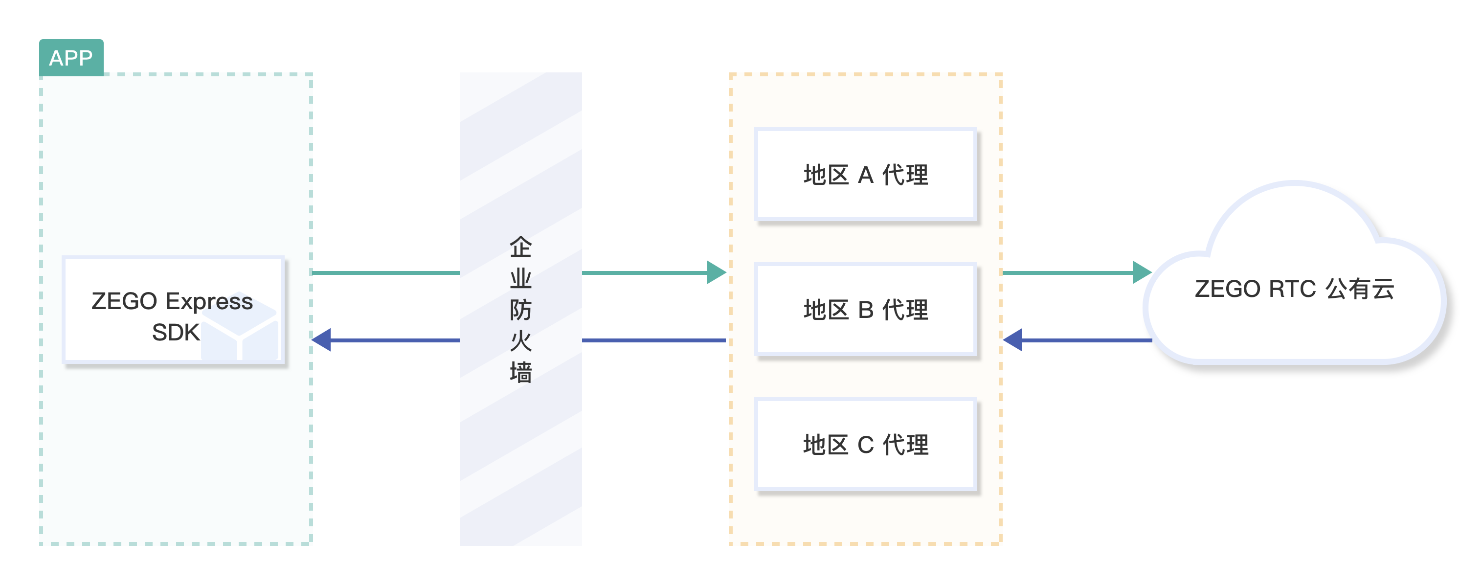通过设置 SDK 的云代理接口,将 SDK 对应的所有流量通过云端的代理服务器中转,实现与 RTC、L3(超低延迟直播)通信。