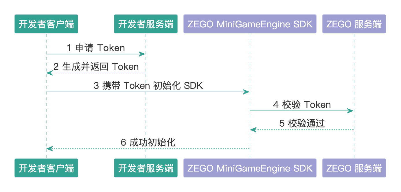 用户初始化 ZEGO MiniGameEngine SDK 之前,您的服务端应先生成 Token,ZEGO 服务端会对带着 Token 的用户进行校验,根据 Token 参数判断用户是否为合法用户。