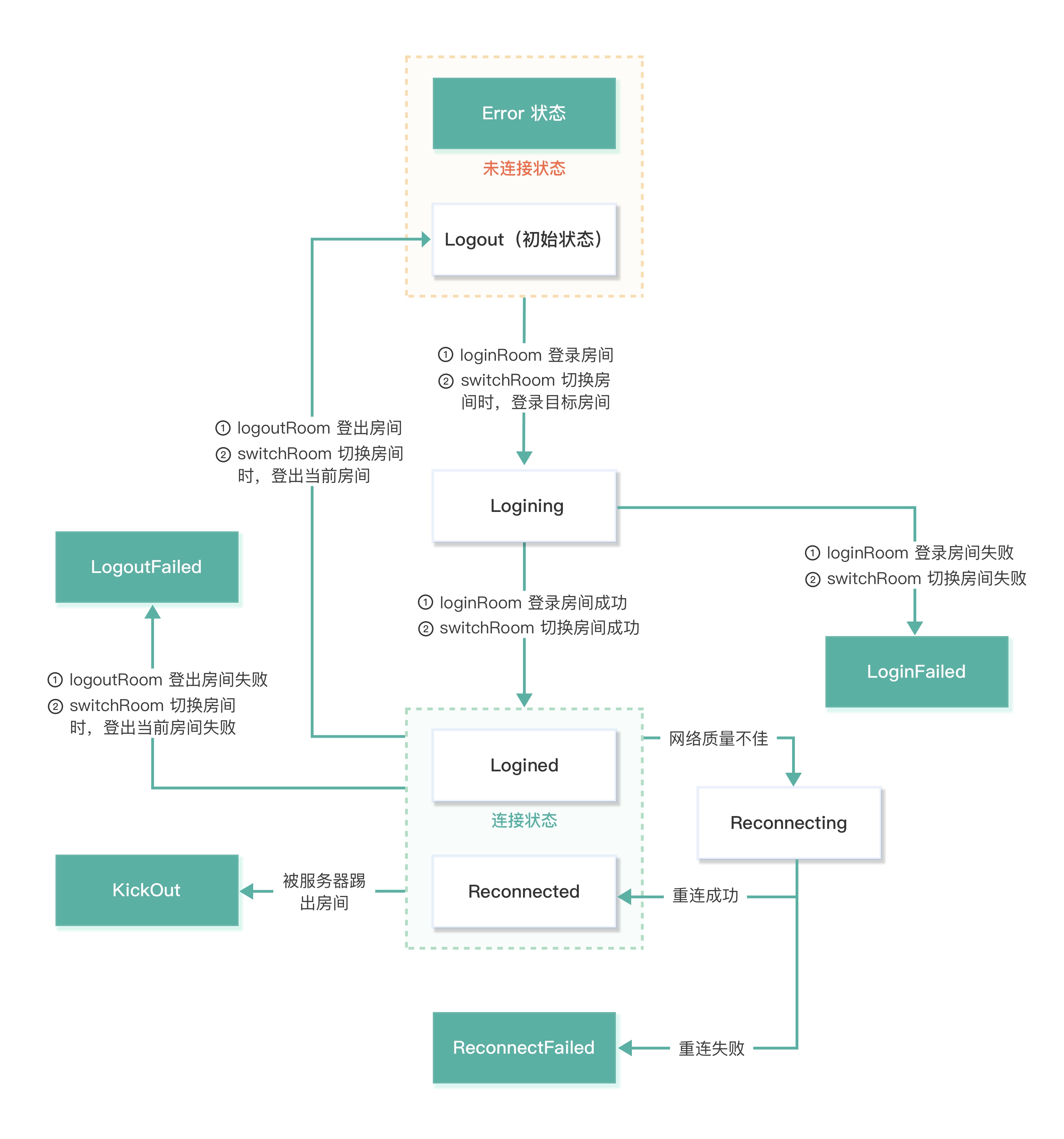 房间连接状态会因多种情况互相转化,开发者可通过房间连接状态发生改变的原因 ZegoRoomStateChangedReason (即房间连接状态)结合 errorCode 做相应的业务逻辑处理。