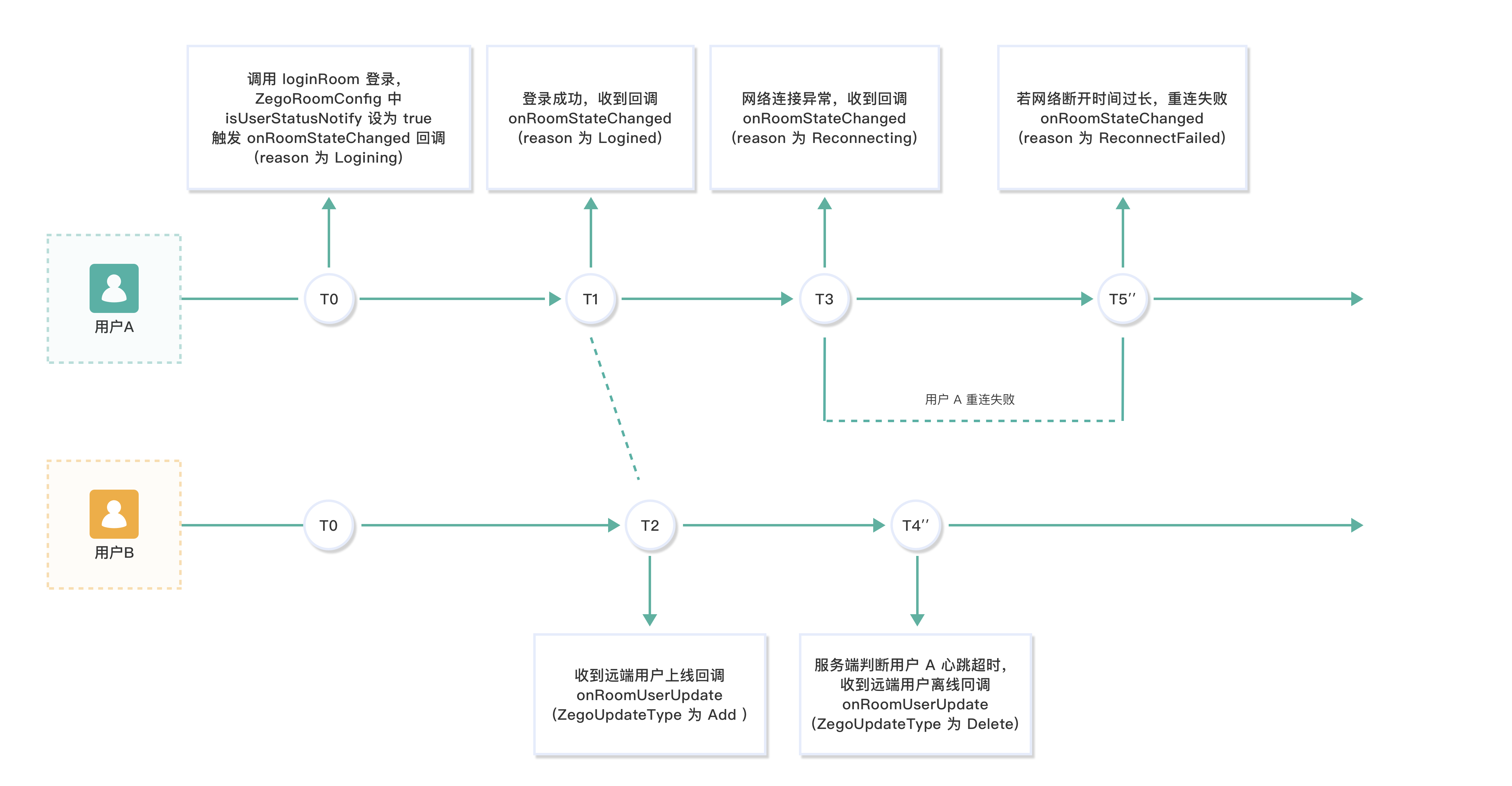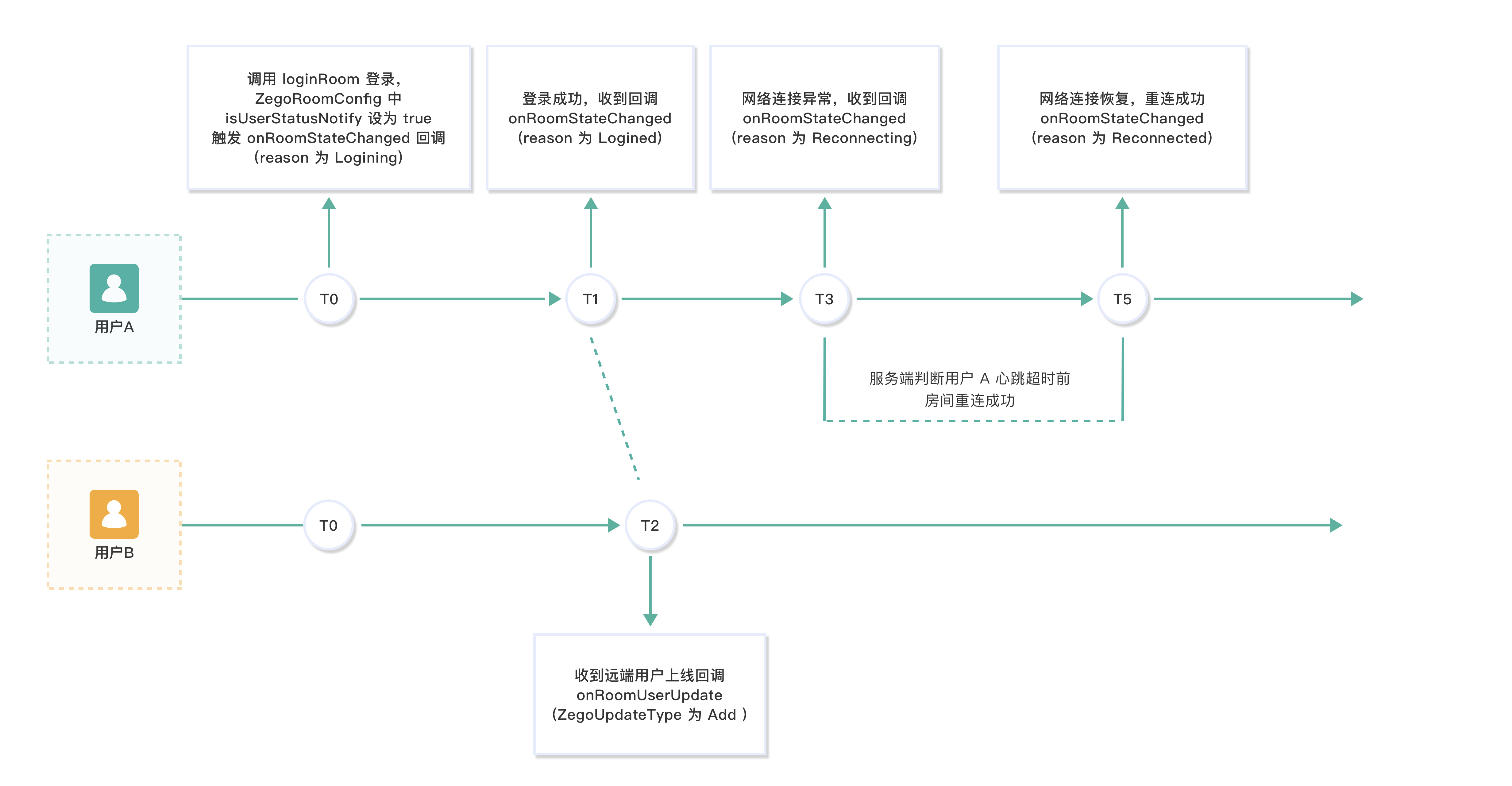 T0、T1、T2、T3 时刻的情况同 情况一:在 ZEGO 服务端判断用户 A 心跳超时前重连成功 中的 T0、T1、T2、T3。
