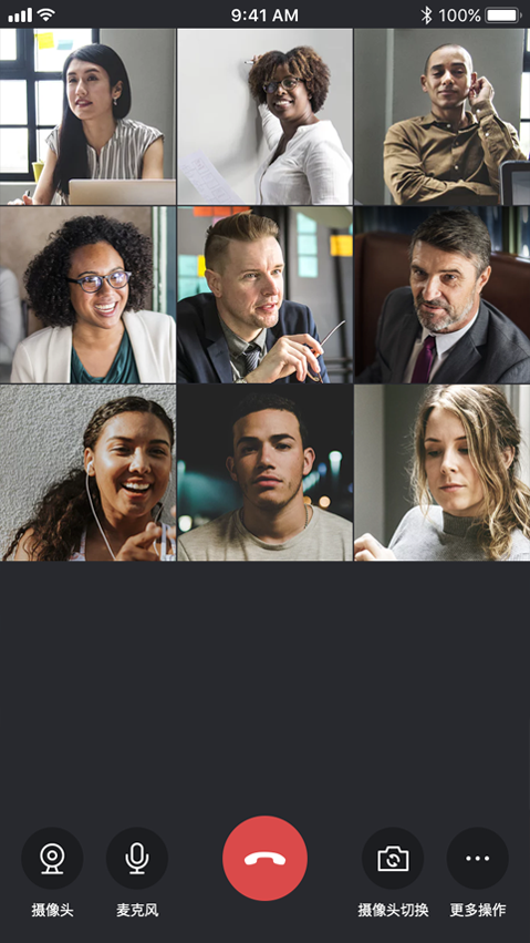 实时视频场景的典型使用之一是同一会话中的多用户进行视频实时通话。即多个人一起互相推拉流,例如:
