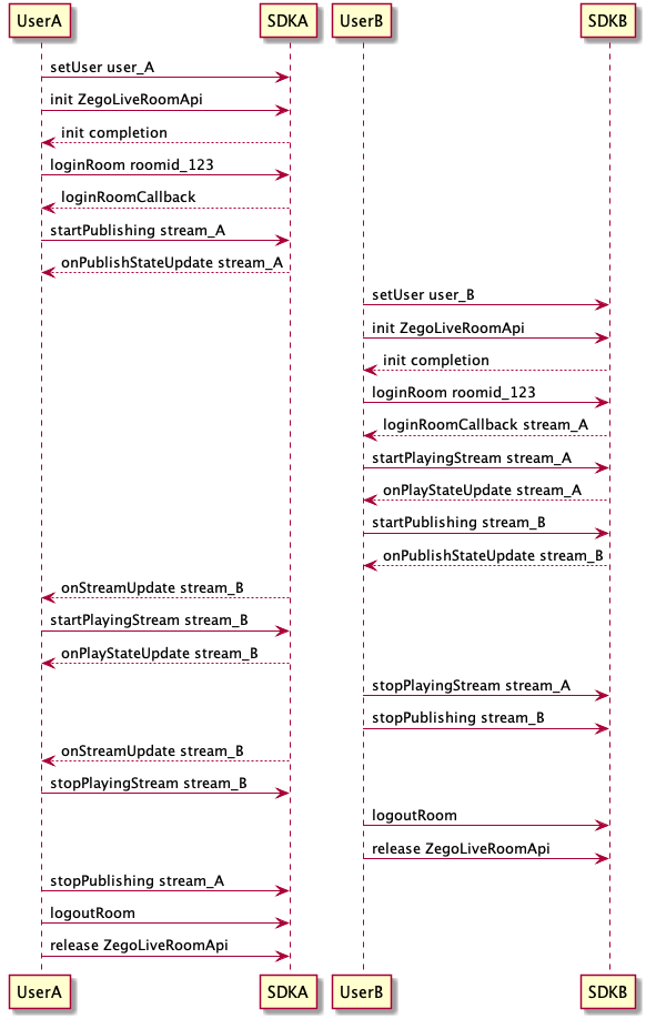 以2人实时视频通话的场景为例,ZEGO SDK 的详细 API 调用时序图如下: