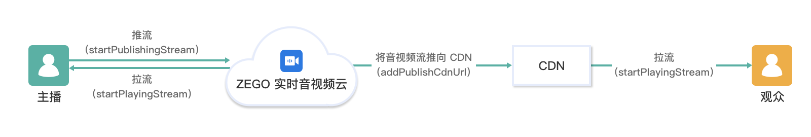 ZEGO Express SDK 支持推流到 CDN(Content Delivery Network,内容分发网络),包括转推 CDN 和直推 CDN 两种功能。开发者基于该功能可打通 RTC 产品和 CDN 直播产品,方便用户从网页或第三方播放器直接观看和收听直播内容。为了保证安全,推流到 CDN 时默认开启 CDN 鉴权。