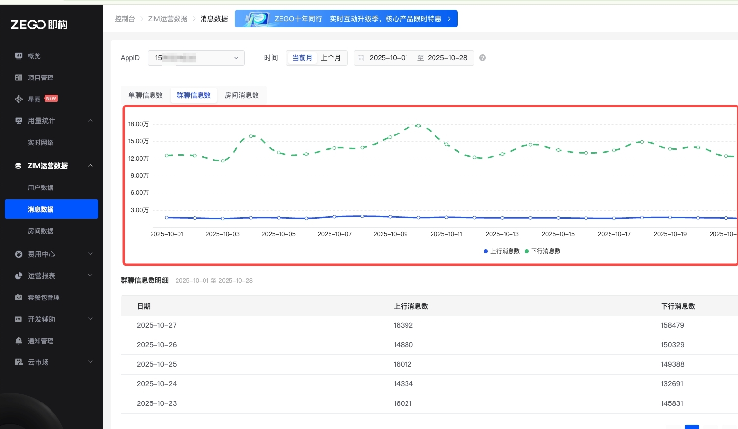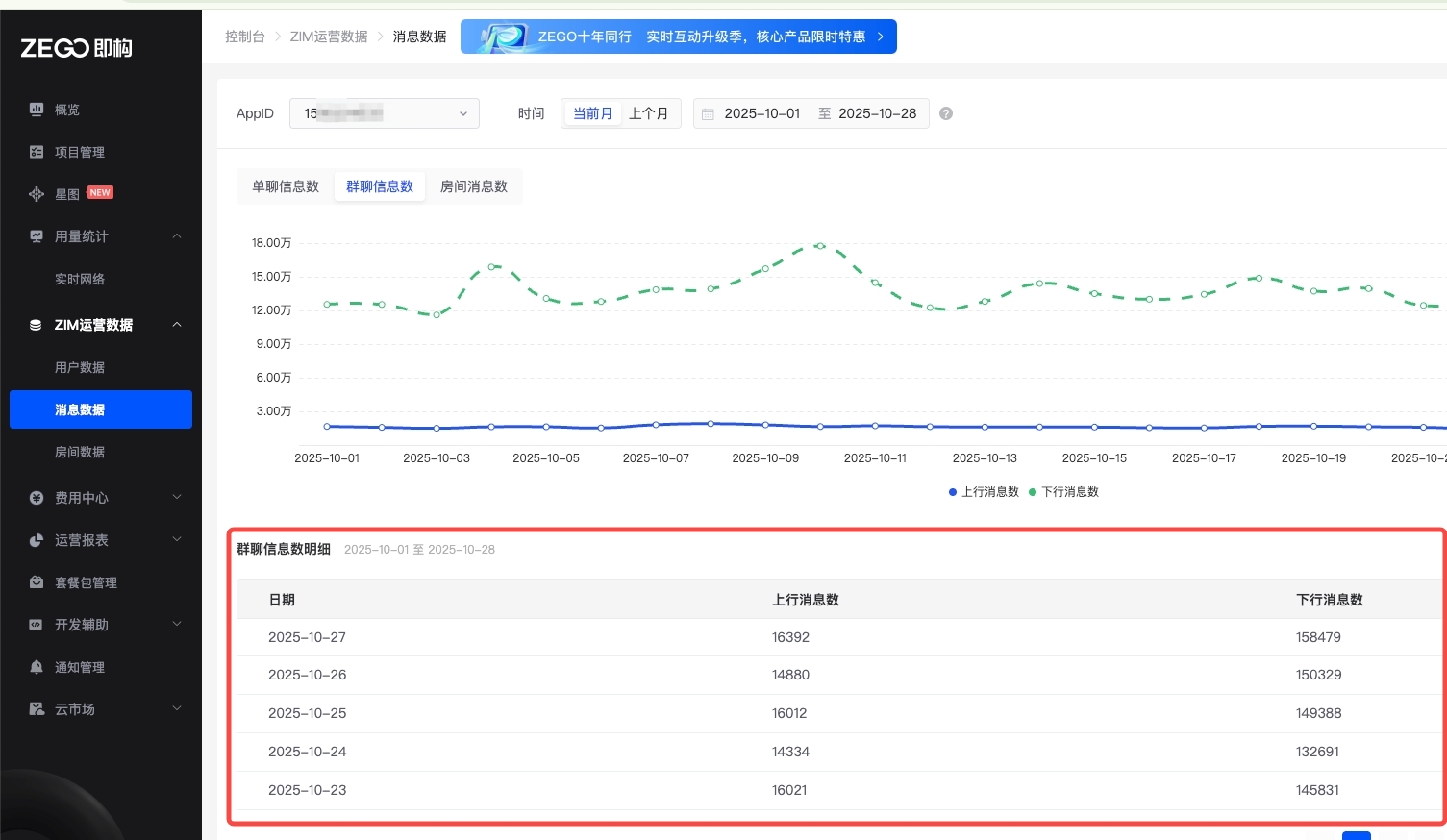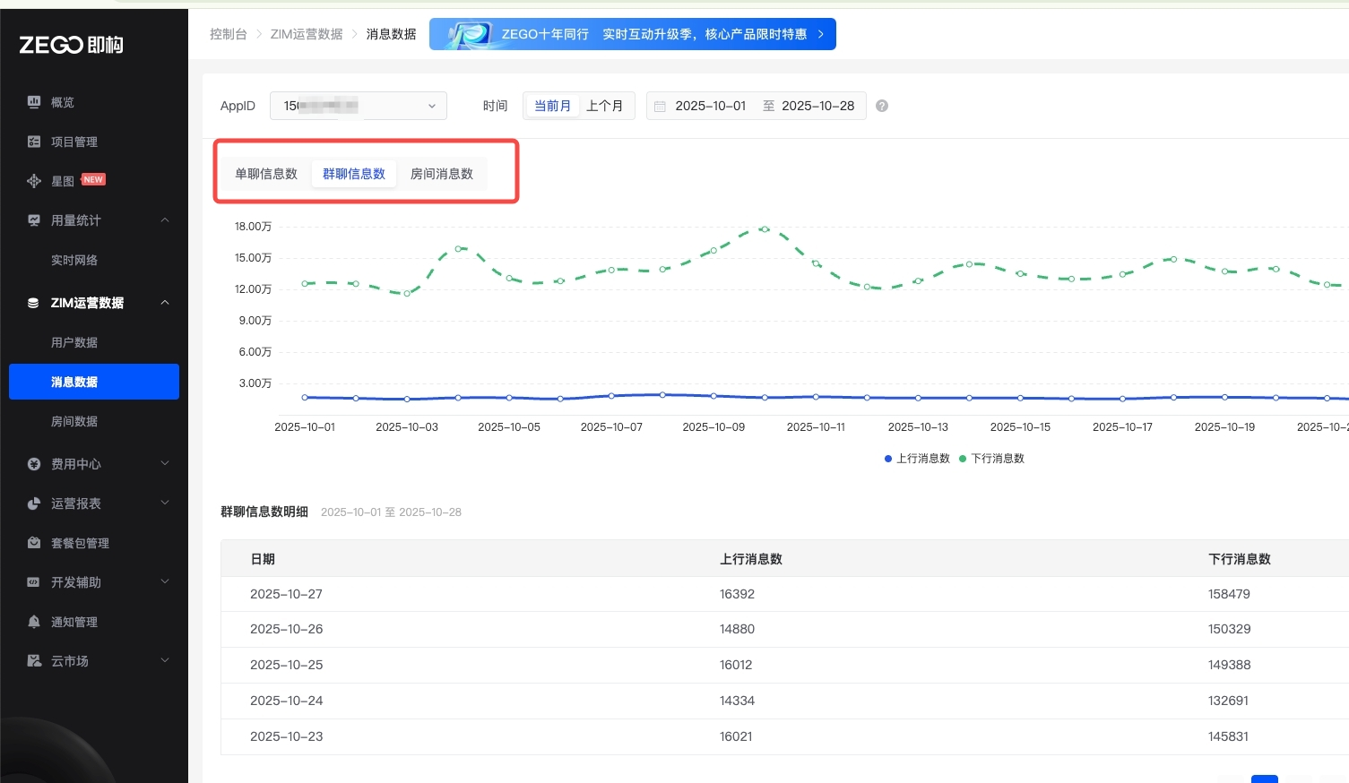 通过 AppID 和 时间维度,可以查询特定时间段的消息数据和房间数据。