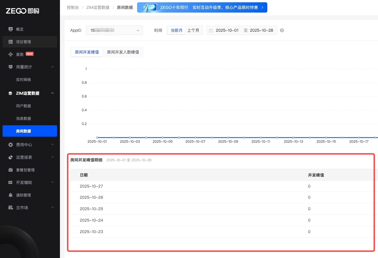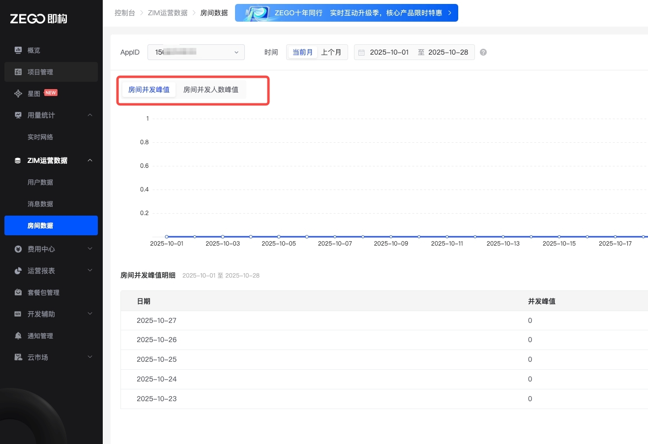 - 前提条件:当前开通了 ZIM 服务时,控制台才会展示 ZIM 的用量数据。