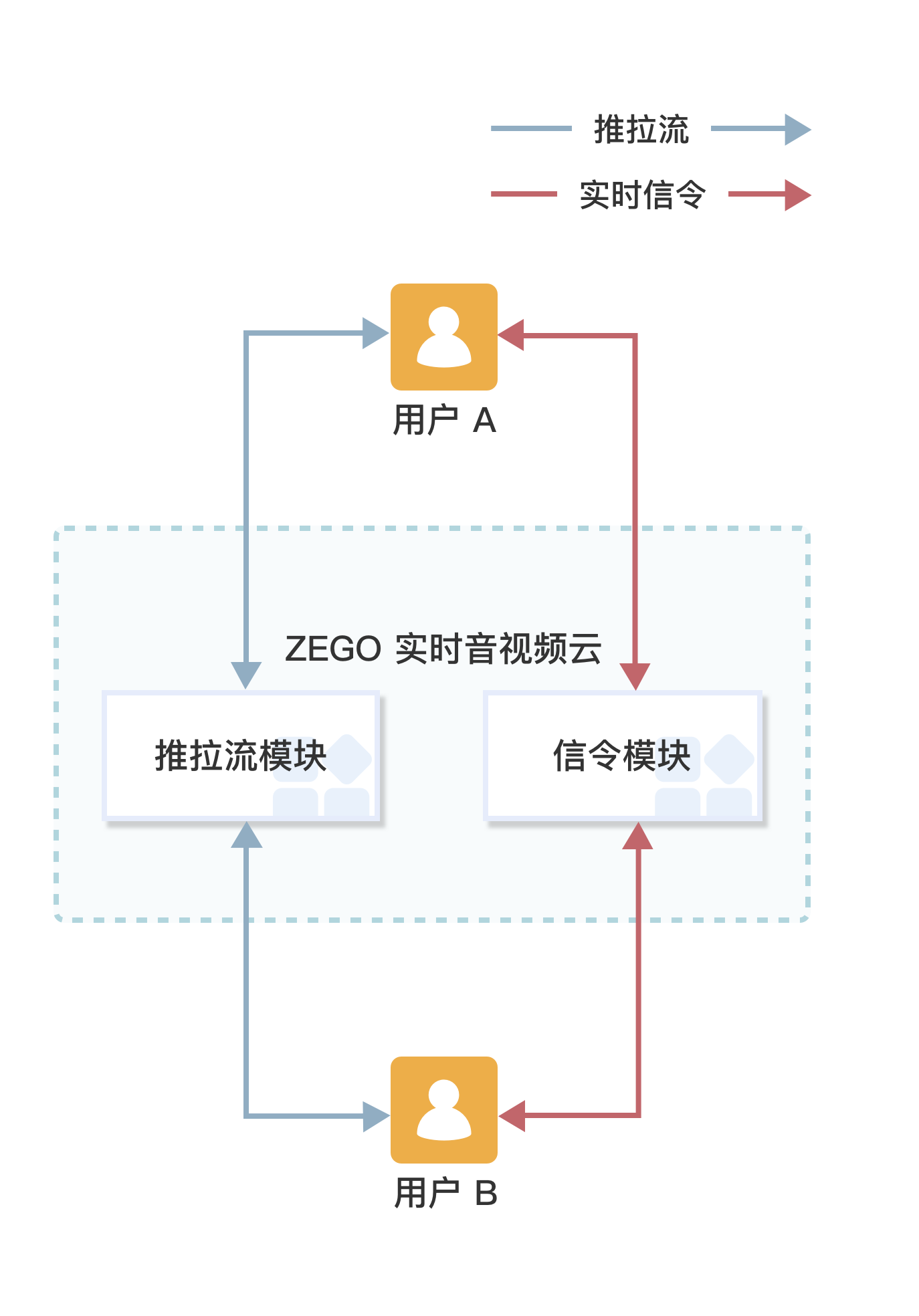 用户需要结束音视频通话时,向 ZEGO 音视频云服务发送结束推流,调用成功后,ZEGO 音视频云服务向房间内其他所有用户发送该用户结束推流信令。房间内其他用户收到信令后停止推流。